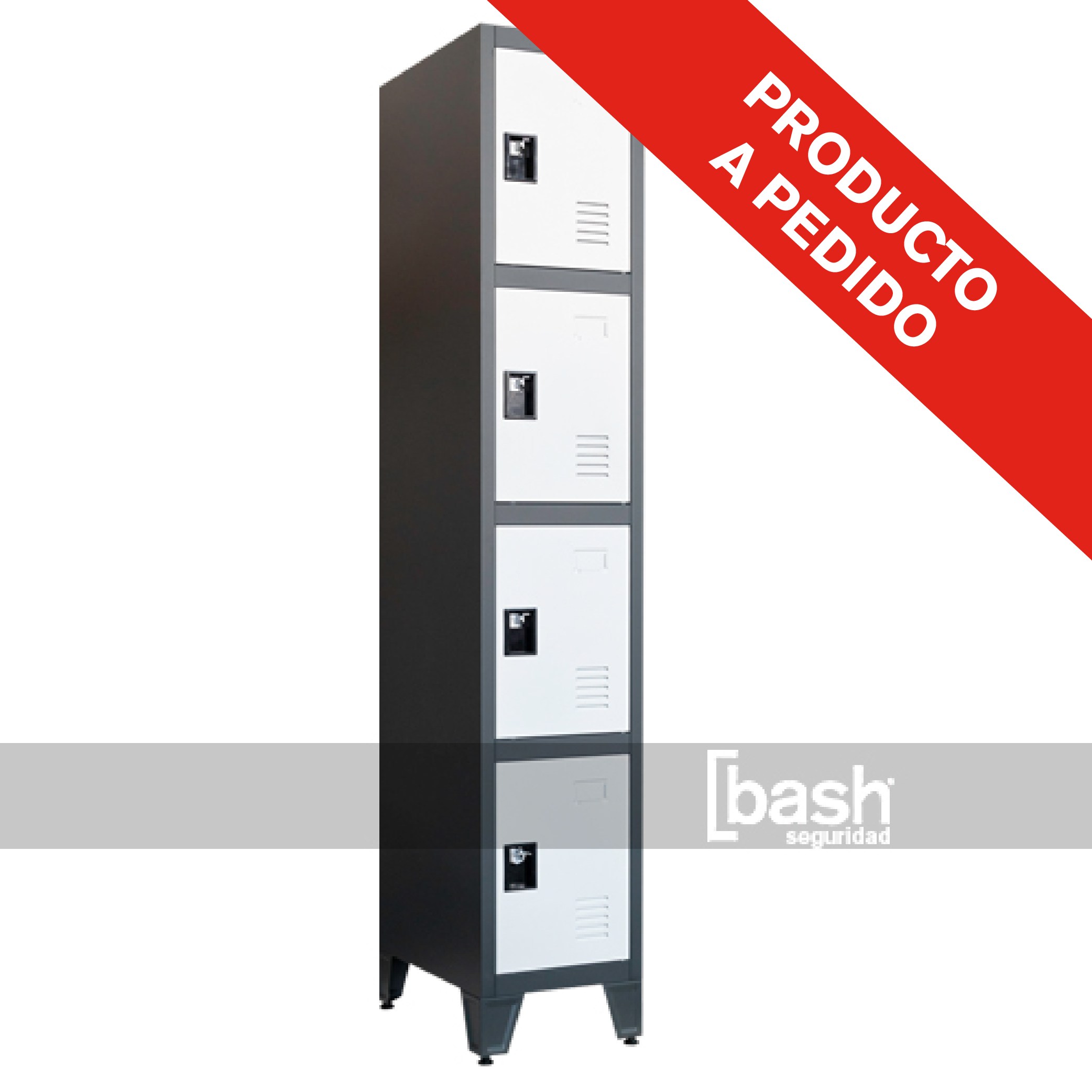 Ropero armable metálico de 1 columna 4 cuartos puerta. Fabricado en plancha de acero laminado en frío de 0,6mm de espesor. Cuenta con celosías de ventilación, barra para colgar, frente con porta-tarjeta y enganche para candado. Posee patín regulable para facilitar su fijación a pisos irregulable.