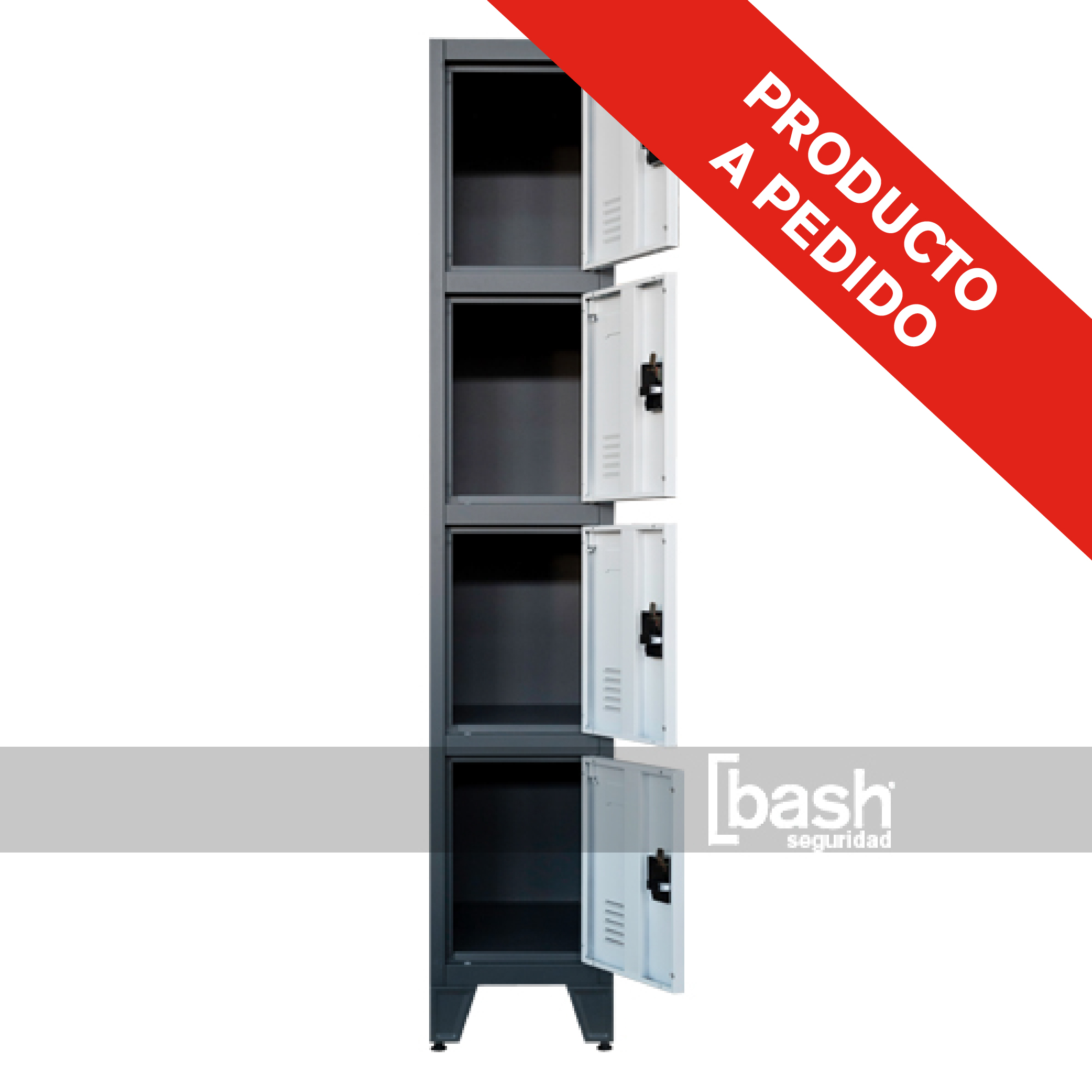 Detalles de pintura: Cuerpo color Gris Grafito, puertas blancas, recubrimiento en polvo hibrido epoxi/poliéster Interpon 700, clasificación “Sandy” (terminación decorativa levemente texturizada, como medida de protección a rayaduras) Cerradura: “Turn Lock” con porta candado, diseño especial embutido para albergar candado de alta seguridad, asegurando manipulación y estética uniforme.